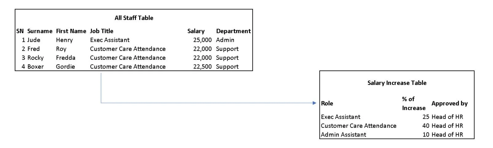 Structured Formats mainly include SQL (Structured Query Language) files and Excel (including other spreadsheets) files. They are structured in human-readable, easy-to-understand tables that show you what each item represents. Each table in a structured data file is often linked to other tables to create relationships. These linkages help you to understand the big picture of the data. The table below shows an example of two linked tables as part of structured data. The field “job title” links the first table to “role” in the second table.