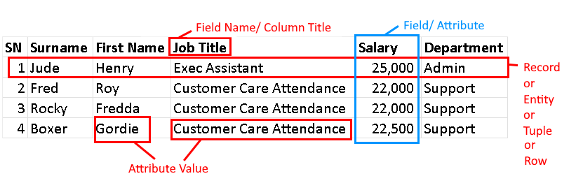 For instance, in a dataset containing employee information, a single record could include attributes such as "First Name", "Last Name", "Job Title", "Salary", and "Department". Each of these attributes provides detailed information about the employees in the dataset.